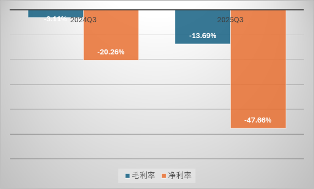 前三季度公司实现营业总收入4.5亿元,同比大幅下滑57.79%;归母净利润-1.51亿元,虽同比小幅收窄0.87%,但仍处于大额亏损状态;扣非归母净利润-1.52亿元,同比下降0.39%,亏损幅度未见实质性改善。单季度数据更能反映经营恶化态势。2025年第三季度公司营收仅1.43亿元,同比暴跌80.13%;归母净利润-5470.89万元,同比亏损扩大27.44%。国晟科技将其归因于:“受光伏行业政策影响,市场需求减少,公司销量下滑”。